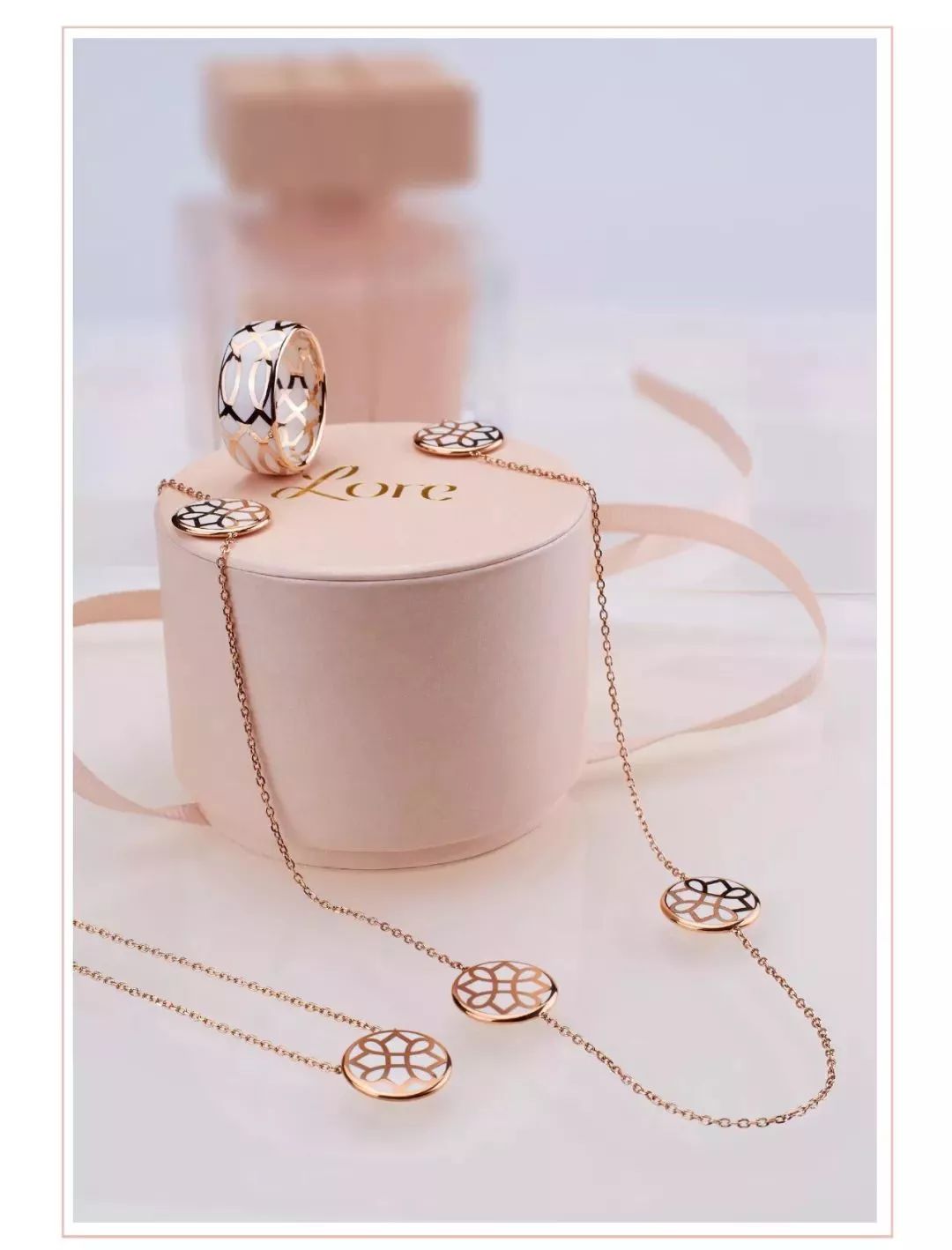 LORE是重温浪漫主义和无限爱的象征。用千分之375的黄金,组成6个精细与优雅的线条和图案。全部由巴黎设计师设计,设计灵感来源于LORE对爱和甜蜜的唤醒。意在通过每一件商品,传达最自然的美与语言。