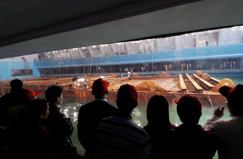 博物馆主场南海一号古船所在的沉箱,考古队员正进行一场水下考古挖掘的动态演示。经过几天的放水调试,沉箱的其中两个探方已微露船舷。据称,沉箱仍不会立即打开,这是为了保护古沉船的微环境。考古人员将采取逐层打开的措施,一点一点地发掘,同时,亦有3名蛙人在水下作业。